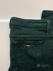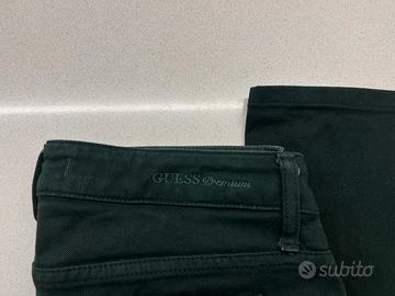 Scritta “Guess premium” cucita sul retro e stemma a triangolo argento con brillantino nella tasca dietro come si vede in foto