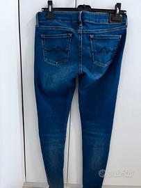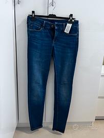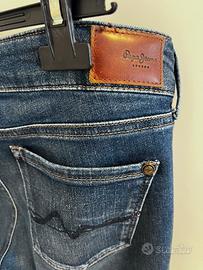 Jeans skinny, marca Pepe Jeans, vita bassa. Taglia 28 L34. Veste una taglia 40 italiana. Con 2% elastame. Col blu scuro leggermente slavato