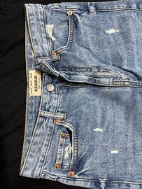 Pull&Bear sono impreziositi da toppe bordeaux cucite a mano, sia sulla tasca posteriore che sotto gli strappi frontali. La tasca posteriore è decorata con una toppa bordeaux a contrasto, interamente cucita a mano con un motivo a fili incrociati che crea un effetto grafico super originale.
