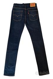 Jeans ragazzo, 5 tasche, 5 passanti, elastico per regolare la vita, chiusura con zip e bottone. Brand: Levi's 501TM Modello: Skinny Colore: blu tg. 16 anni / 176 cm Misure: vita cm 35 cavallo cm 23 lunghezza cm 105 Composizione tessuto 79,5% cotone 19,2% poliestere 1,3% elastane Usato in ottime condizioni (indossato, forse, 5 volte). Fornisco altre foto dettagliate su richiesta.