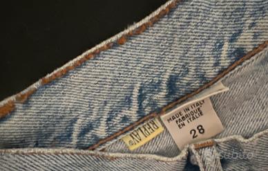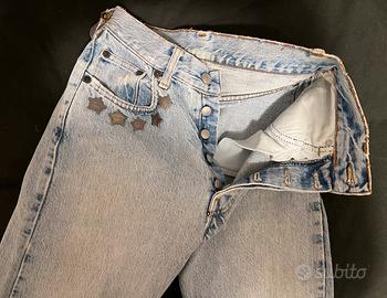 Jeans Replay vintage in ottimo stato, con dettagli decorativi metallici che richiamano il Wild West: stella dello sceriffo inserita di lato sulla cintola e stelle che decorano le tasche avanti e dietro. Modello unico nel suo genere. Taglia 28 usa (42 italiana).