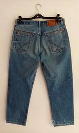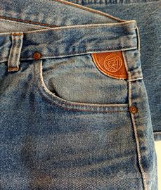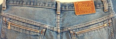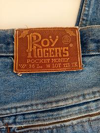 Jeans vintage da uomo marca Roy Rogers in denim blu. Modello classico a gamba dritta. Patch in pelle sul retro e sul taschino anteriore Taglia 36. Misure: *Vita 42 cm; *Fianchi 60 cm; *Lunghezza 102.5 cm. Condizioni perfette. Unico difetto: la cerniera della tasca posteriore destra ha perso il perno.