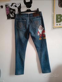 Jeans in denim con stampa dei Sette Nani di Disney, perfetti per chi ama uno stile playful/vintage con un tocco character.