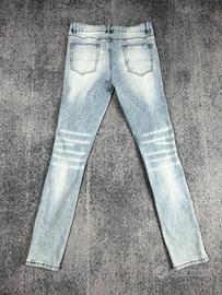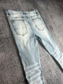 Jeans in denim lavaggio azzurro chiaro, modello slim fit, con strappi impreziositi di diamanti e dettagli destroyed sulle gambe per uno stile moderno e streetwear.