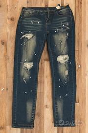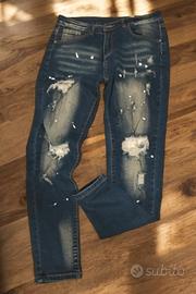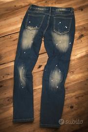 sono jeans skinny da uomo in denim con strappi e schizzi di vernice.