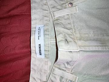 Pantaloni straight leg Bershka taglia EUR 46 in colore crema, leggermente baggy per un look comodo e moderno. Realizzati in tessuto morbido e versatile, con chiusura con zip e bottone e tasche laterali e posteriori, perfetti da abbinare a qualsiasi outfit casual o curato.