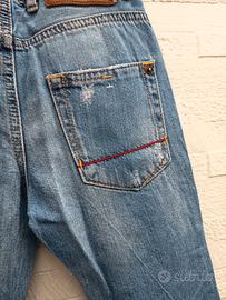 Modello slim fit in denim chiaro con effetto vissuto e strappi decorativi con toppa interna nera.