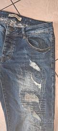 Vendo jeans modello strappato per ragazzo. Leggermente elastico. 99% cotone e 1% elastan.In ottimo stato. Tagliato sotto a entrambe le caviglie quindi strappato anche sotto. Tasche e bottoni in perfetto stato. No zip ma bottoni anche davanti nella chiusura. Vita 37 cm, cavallo 22 cm, lunghezza 97 cm.