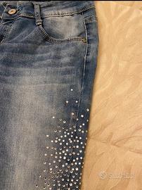 Jeans chiari con pioggia di strass sui lati delle gambe. Taglia L ma in realtà vestono una S. Nuovi, mai messi (proprio perché credevo fossero una L)