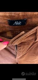 Jeans a coste Akè da donna, in velluto morbido color marrone. Modello a vita media con chiusura a zip e bottone frontale, dotato di tasche anteriori e posteriori. Taglia 40, vestibilità slim, adatto per la stagione autunnale/invernale. Taglio moderno e versatile, perfetto da abbinare sia a look casual che più ricercati. Condizioni ottime, usato pochissimo.