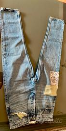 Il design richiama un’estetica vintage e handmade, con richiami alla moda sostenibile e al recupero dei materiali, trasformando questi jeans in un pezzo unico e dal carattere deciso.
