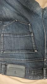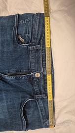 Vendo jeans Trussardi Jeans originali, caratterizzati da un lavaggio blu medio con zone più chiare (effetto stone washed) che donano un look moderno e dinamico. Il denim è di alta qualità, con una trama resistente ma confortevole.