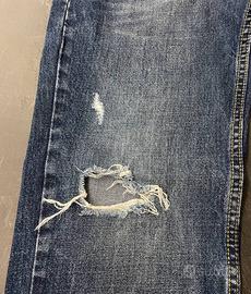 Jeans blu scuro da uomo a vita bassa in denim con sfumature più chiare e strappi per un effetto invecchiato.