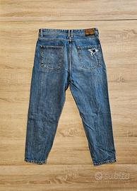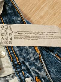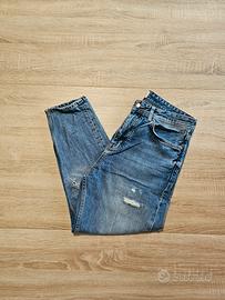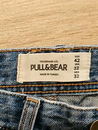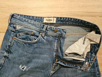 Jeans uomo Pull&Bear, tonalitá denim scuro. Con strappi all'altezza delle ginocchia e sulla tasca posteriore sinistra. Condizioni eccellenti, 100% cotone. Taglia L Ampiezza vita 42cm Lunghezza 91cm Lunghezza dal cavallo 62cm