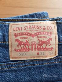 jeans uomo Levi's modello 510™ Skinnyin denim blu. Taglia W31 L34 (Vita 31, Lunghezza 34). Classico design a 5 tasche con l'iconica toppa in pelle Levi Strauss & Co. e la "Red Tab" sulla tasca posteriore. Usato poco, in buone condizioni