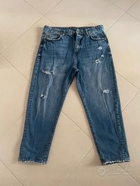 Bellissimi jeans Pull&Bear modello mom fit in denim blu medio. Il taglio è quello classico a vita alta, leggermente più comodo sulle cosce e che si stringe verso la caviglia. Caratteristiche principali: • Effetto Distressed: Presentano strappi decorativi sul davanti e orlo a taglio vivo (frayed) per un look urban e casual. • Materiale: 100% Cotone (denim robusto, non elasticizzato). • Condizioni: Ottime, indossati pochissime volte. Il tessuto e le etichette sono perfettamente integri. • Taglia: EUR 44 / MEX 34 (corrisponde a una 44 italiana)