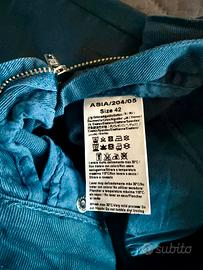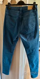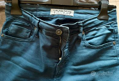 Jeans color verde petrolio, 5 tasche, strappi sulle ginocchia, modelli slim, taglia 42