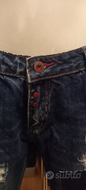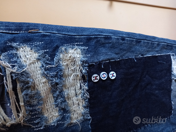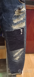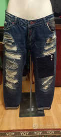 Jeans blu scuro con tagli e toppe e paillettes molto originali . Tg M . MAI MESSI