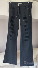 Jeans in cotone nero, a zampa, con strappi, strass e borchiette sul davanti. Vintage. Vita bassa. Tg XS ma vestono una S.