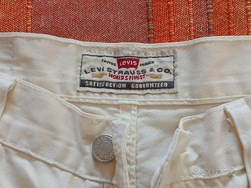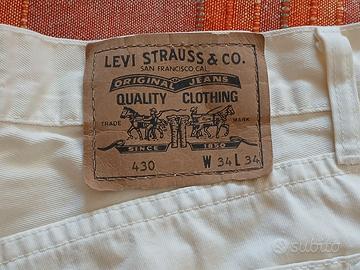 Jeans vintage anni 90 da uomo Levi's 430. Questi jeans sono un modello vintage con vestibilità straight leg (gamba dritta). La taglia indicata sull'etichetta è: W34 L34 (vita 34, lunghezza 34). I jeans sono un modello con taglio a gamba dritta e vita alta, caratterizzato da una chiusura con bottoni a vista. Sono di colore panna (bianco). Il logo ricamato e la cucitura a forma di "doppio arco" sulla tasca posteriore, nota come "Arcuate" sulla tasca posteriore sono caratteristiche distintive del marchio Levi's.