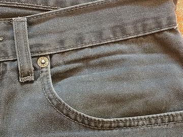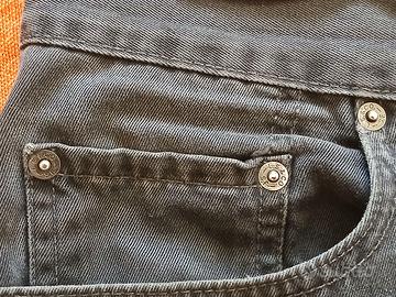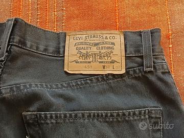 Jeans vintage anni 90 da uomo Levi's 451. Questi jeans sono un modello vintage con vestibilità straight leg (gamba dritta). La taglia indicata sull'etichetta è: W32 (larghezza della vita di 32 pollici) ed L: (la lunghezza è indicata genericamente come "L" lunga. I jeans sono un modello con taglio a gamba dritta e vita alta, caratterizzato da una chiusura con bottoni a vista. Sono di colore grigio scuro (antracite). Il logo ricamato e la cucitura a forma di "doppio arco" sulla tasca posteriore, nota come "Arcuate" sulla tasca posteriore sono caratteristiche distintive del marchio Levi's.