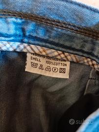 Pantalone in denim blu chiaro, realizzato in cotone 100%, dal taglio classico e molto versatile. Anni 80 made in Italy vita regolare con passanti per cintura chiusura con bottone e zip due tasche laterali + due tasche posteriori a filetto gamba dritta leggermente ampia presenza di pinces frontali (pieghe) per una vestibilità più comoda Il tessuto è un denim morbido e leggero, con lavaggio chiaro effetto leggermente vissuto. Perfetto per look casual o vintage. Vestibilità: morbida/regular fit Materiale 100% cotone (come da etichetta) Ottime condizioni come lo stato di conservazione Tg. 48/50 ma controllate le misure Misure Vita 43 cm Cavallo 30 cm Lunghezza totale 100 cm Larghezza coscia 33 cm Larghezza caviglia 23 cm