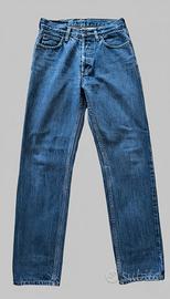 Chiusura con bottoni metallici invece della classica zip. Tessuto denim resistente, 100% cotone. Vestibilità dritta e leggermente ampia, taglio ispirato ai modelli tradizionali.