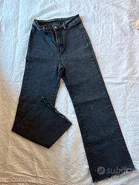 Jeans vita alta elasticizzato, vestibilità standard, scende stretto e sulla parte finale scende a zampa con effetto strappato. Sul retro porta le tasche.