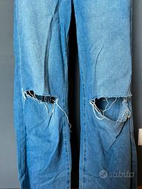 Jeans a gamba larga modello wide leg, vita alta, con strappi importanti sulle ginocchia e fondo leggermente sfrangiato.