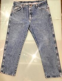 Jeans Wrangler originali, denim blu con effetto vissuto, modello classico a cinque tasche, in ottime condizioni. Ideali per look casual e resistenti all’uso quotidiano.