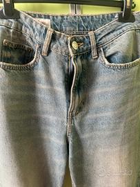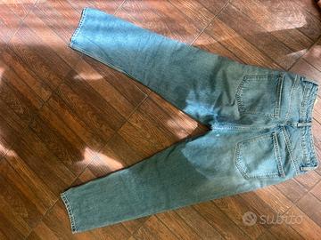 Jeans denim che scende a sigaretta , vita medio alta, taglia come da etichetta .