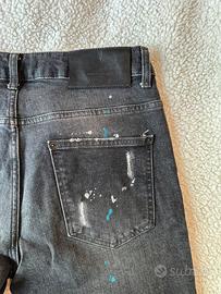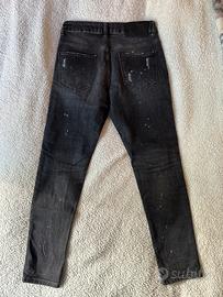 Zara in denim nero effetto vintage, con strappi, abrasioni e schizzi di vernice studiati per dare un look streetwear autentico e moderno.