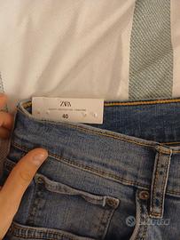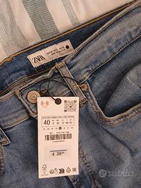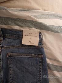 Jeans in denim blu chiaro, dal lavaggio uniforme con leggere sfumature piĂą chiare sulle gambe. Il tessuto appare morbido e leggermente elastico, tipico dei modelli comodi e versatili di Zara.