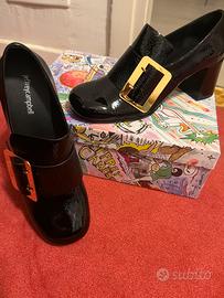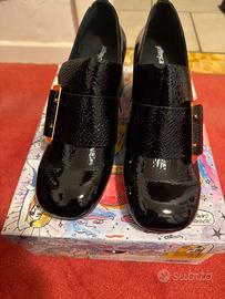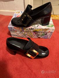 Marca: Jeffrey Campbell • Modello: Mylas (stile Mary Jane/Mocassino con tacco) • Colore: Nero lucido (effetto vernice/naplak) • Caratteristiche: Maxi fibbia decorativa frontale, tacco largo a blocco molto stabile, punta arrotondata. • Condizioni: Ottime (come da foto). • Scatola originale: Inclusa con grafica originale Jeffrey Campbell.