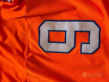 Maglia sportiva stile football americano, colore arancione acceso con dettagli blu e bianchi. Numero 9 stampato sul retro. Patch decorative sulle maniche e sul petto, stile vintage ispirato agli anni ’90. Taglia comoda, tessuto traspirante a rete. Ottima per collezionisti, appassionati di streetwear o look sportivo old school. In ottime condizioni!