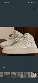 Sneakers alte Jimmy Choo in pelle bianca, decorate con un motivo di stelle in rilievo. - Dettagli con borchie e strass. - Chiusura con lacci. - Logo Jimmy Choo sul lato e sulla suola.