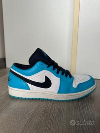 Vendo Nike Air Jordan 1 Low University Blue (UNC) in ottime condizioni generali e tenute con cura, con scatola originale in buono stato. Acquistate qualche anno fa presso Footlocker. Taglia EUR 41. Piccoli normali segni di usura solo sulla suola, ma niente di evidente. Per maggiori foto o informazioni contattare. Possibilità di ritiro ad Avigliana.