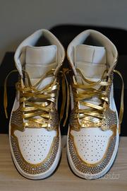 Jordan 1 Mid SE bianca e oro , con strass . taglia EU 45.5 , fatta su richiesta e base Jordan 1 originale con scatola.