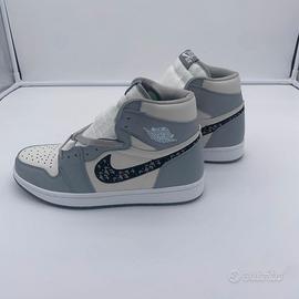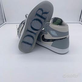 La Dior x Air Jordan 1 High mira a colmare il divario tra abbigliamento sportivo street-ready e moda premium e fa parte di una partnership più ampia che include calzature, vestiti e accessori. L'interpretazione di Kim Jones sulla leggendaria scarpa ha una tomaia bianca e grigia realizzata in pelle italiana con bordi dipinti a mano. Un'etichetta Dior intrecciata sulla linguetta, uno Swoosh Nike in jacquard Dior Oblique e le suole color ghiaccio espongono un emblema Dior e Dior Wings su ciascuna scarpa sono tra i doppi tocchi di branding.