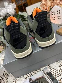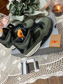 Jordan 4 Undefeated nuova release del 2025. Completa di lacci aggiuntivi arancioni e cartolina del primo negozio storico di Los Angeles. Scarpa che riprende la famosa release ultra-limitata a soli 72 paia nel mondo del 2005. Estetica militare e tomaia verde oliva in nubuck con inserti neri ed arancioni. Taglia 44(US10).