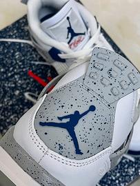 The Air Jordan 4 Retro White Midnight Navy dresses in white, midnight navy, and light smoke grey colorway.