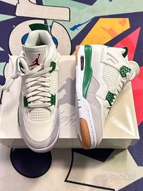 The Jordan 4 Retro SB Pine Green used a white leather upper with a Neutral Grey suede mudguard. The limited edition sneakers sit on top of a white and Pine Green midsole which is highlighted by a red air unit. Nike used a gum outsole to help with increased grip while skateboarding.