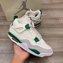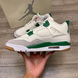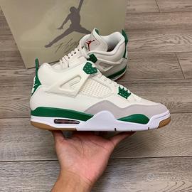 The Jordan 4 Retro SB Pine Green used a white leather upper with a Neutral Grey suede mudguard. The limited edition sneakers sit on top of a white and Pine Green midsole which is highlighted by a red air unit. Nike used a gum outsole to help with increased grip while skateboarding.