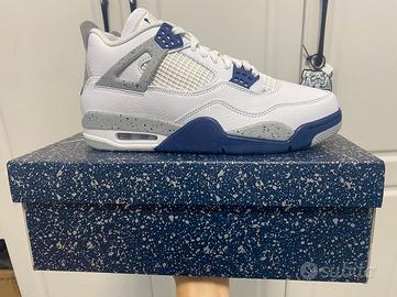 The Air Jordan 4 Retro White Midnight Navy dresses in white, midnight navy, and light smoke grey colorway.