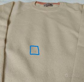 Pull uomo in misto lana (Cashmere, merino, angora) e sintetico; colore molto particolare giallo/arancio molto pallido. Indossato pochissime volte,ha ora una piccola macchia di origine sconosciuta sul davanti.