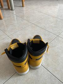 Vendo queste scarpe sportive alte in colorazione gialla e nera, comode e dal look accattivante. Hanno una linea moderna, simile ai classici modelli da basket, con tomaia in materiale sintetico e dettagli ben rifiniti.