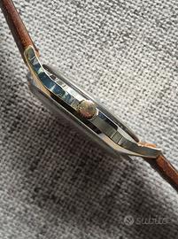 🇩🇪 Junghans Vintage Quartz Un raffinato orologio della storica manifattura di Schramberg, un segnatempo vintage al quarzo, precursore del max Bill, che rappresenta l'equilibrio ideale tra sobrietà estetica e precisione tecnica, mantenendo inalterato il fascino del design d'epoca. Grazie alla conformazione delle anse, l’orologio offre una presenza al polso maschile e femminile bilanciata e armoniosa. * Diametro della cassa: 34 mm * Spessore: 8 mm * Lug-to-Lug: 40 mm. ⚙️ Specifiche Tecniche e Caratteristiche * Quadrante in una splendida tonalità bianco panna/avorio, caratterizzato da un layout pulito e minimale. Gli indici a bastone applicati in rilievo donano profondità, completati dalla finestra del datario posizionata a ore 3. * Movimento: Calibro al quarzo marchiati Junghans Made in germany ad alta affidabilità, sinonimo di precisione cronometrica costante e bassa manutenzione. * Vetro in plexiglass originale, conservato in condizioni eccellenti, che conferisce al quadrante la tipica morbidezza visiva dei modelli d'epoca. * Cassa nichelata che presenta una fascinosa patina del tempo; il viraggio verso tonalità dorate in alcuni punti (visibile lateralmente) ne certifica l'autenticità vintage. Il fondello è serrato a pressione in acciaio inossidabile (Stainless Steel Back). * Cinturino: Pelle di alta qualità in tonalità marrone, che esalta il calore del quadrante e la patina della cassa. L'orologio è completamente funzionante e tiene correttamente il tempo. È un pezzo ideale per il collezionista di orologeria teutonica o per chi cerca un accessorio pronto all'uso nel quotidiano e dal forte carattere storico. #junghans #junghansvintage #madeingermany #orologiovintage #vintagewatch #quartzwatch #orologiuomo #minimalismo #germanwatch #orologioelegante #datario #plexiglass #vintagestyle #horology #germanprecision #classicwatch #dresswatch #orologiodapolsouomo #collezionismo