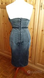 Magnifico vestito tubino bustier originale Just Cavalli denim dress, taglia 44IT, nuovo, con cartellino ed etichette, purtroppo mai indossato perché troppo piccolo per me; dotato di ologramma di sicurezza e di checking code a garanzia della sua autenticità, MADE IN ITALY, in denim delavé color antracite (98% cotone, 2% elastam). Modello della pre-collezione Autunno/Inverno 2010-2011, molto femminile, grintoso e moderno, la cui parte superiore è concepita come un corsetto, con stringhe anteriori e posteriori ad esaltare il punto vita e la figura a clessidra, accentuata ulteriormente da due fasce elastiche che si fissano sul velcro di strisce di tessuto di jeans. Cerniera lampo laterale, gonna aderente con spacco posteriore.