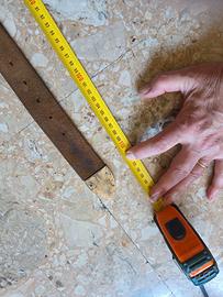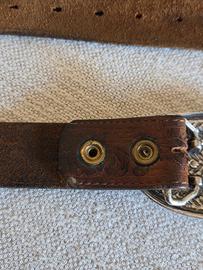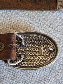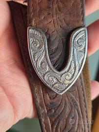 Cintura in cuoio molto morbido della casa Justin (USA), la cui fibbia originale, raffigurante un ferro di cavallo Western (obsoleto), è stata sostituita con altra stile basket made in Italy di ottima fattura. Misure in foto.