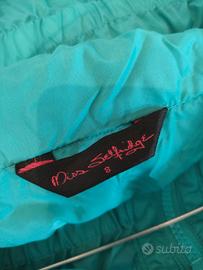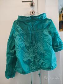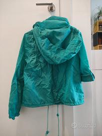 K-way antipioggia turchese, con due tasche frontali, laccetti per stringere in vita, bottoni per fissare le maniche e chiusura a zip per richiudere il cappuccio. Taglia EUR 36. Mai usato. Marca Miss Selfridge (ora ASOS)